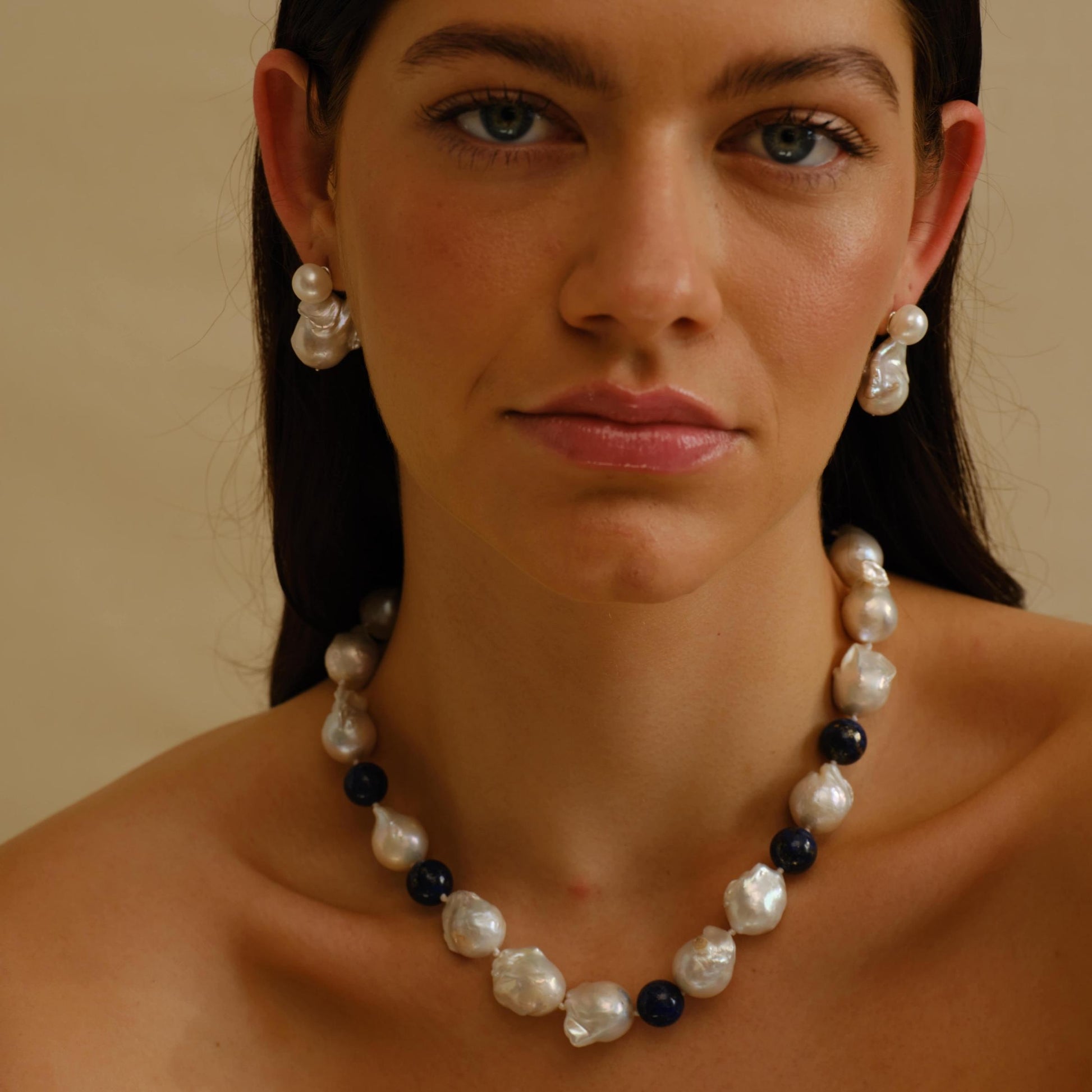 Deep midnight-blue lapis stones are paired with luminous rough baroque pearls, their natural silver hues creating a captivating contrast of colour and texture. Finished with a sterling silver Senorita clasp, this 46 cm design embodies the artistry and timeless elegance that define The Lullu Edit.
