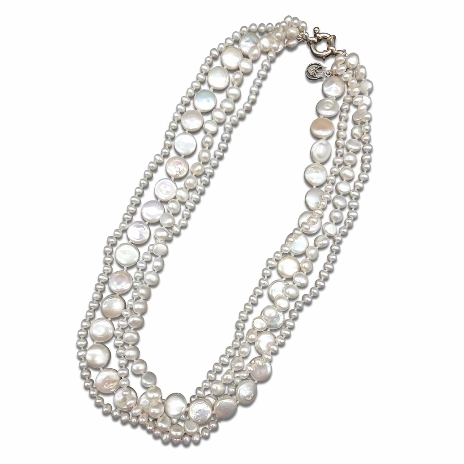 • Four-strand necklace featuring Keshi, coin and potato pearls
