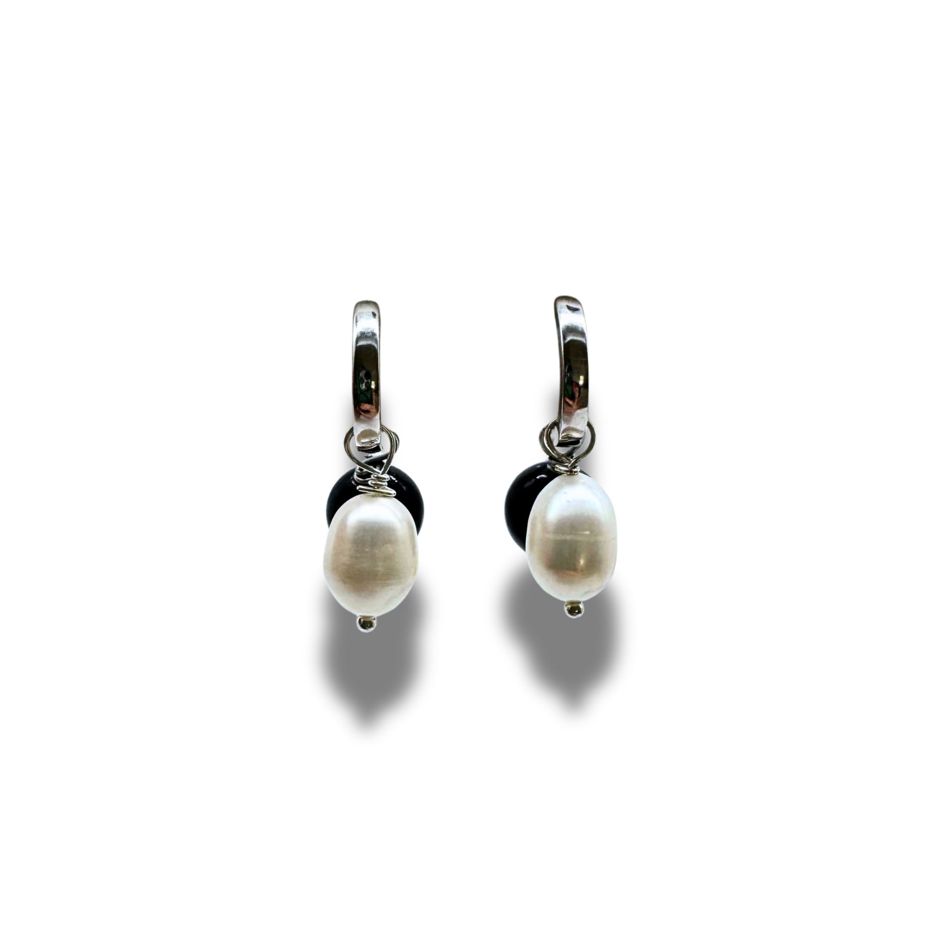 Mysterious, bold, and striking. The Moon Silver Huggies pair timeless sterling silver hoops with deep black agate gemstones for a sleek, contemporary edge. Accompanied by a removable 9mm teardrop freshwater pearl and a round black agate gemstone charm (10–12mm).